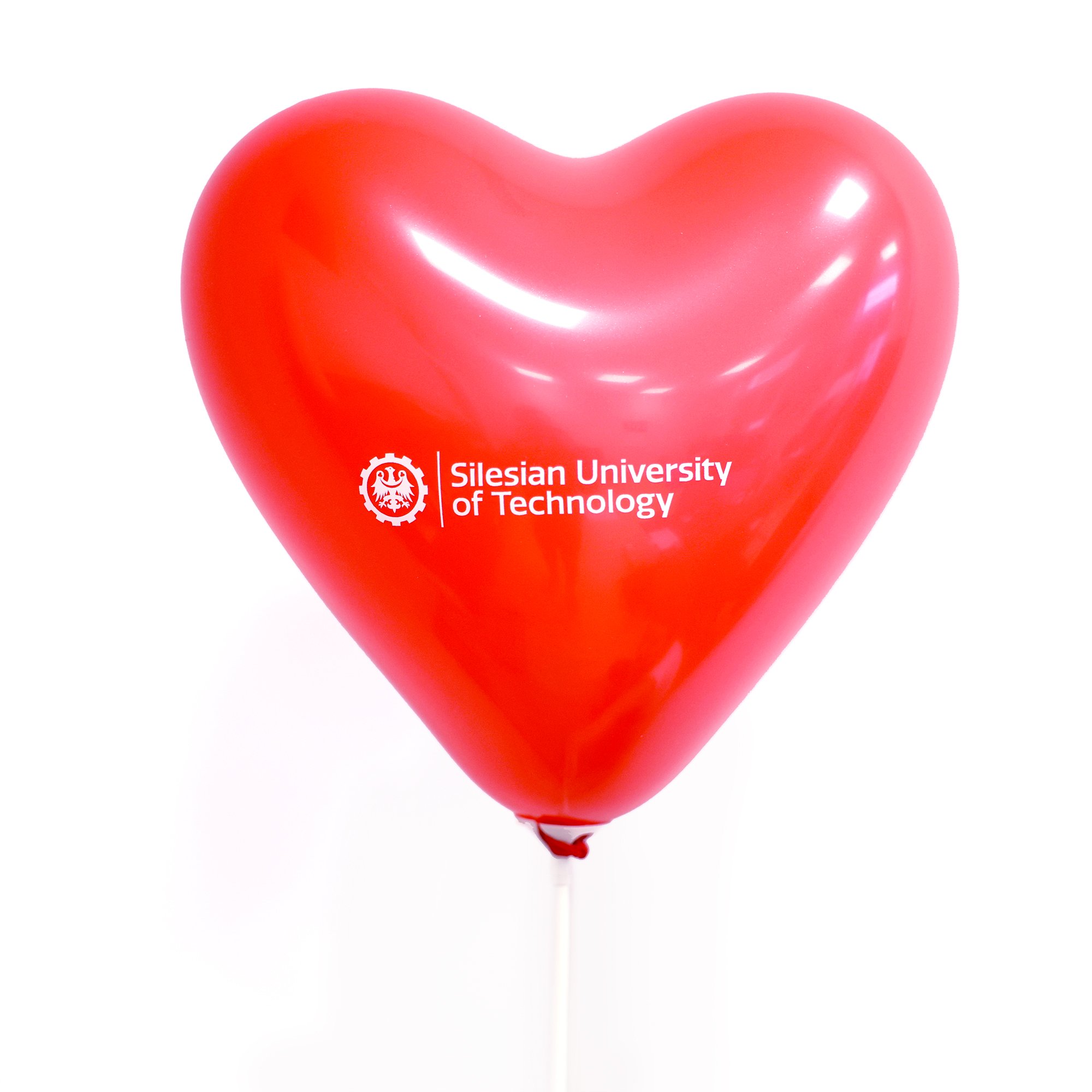 Balon w kształcie serca z logo Politechniki Śląskiej w wersji polskiej i angielskiej.