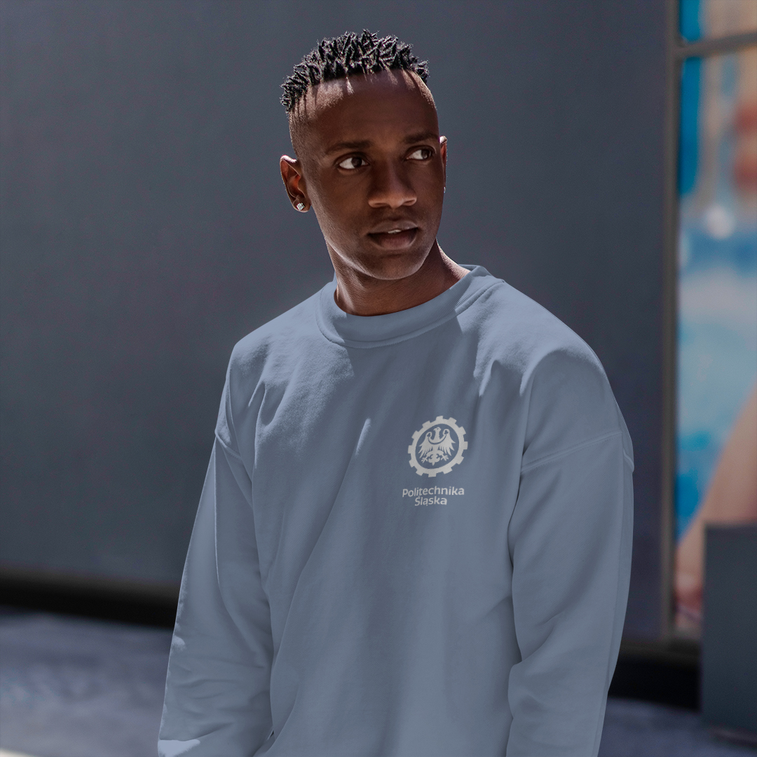 Model o nowoczesnym, prostym kroju (slim fit), z wszywanymi rękawami (set-in) i okrągłym dekoltem. Szerokie ściągacze przy mankietach i u dołu bluzy zapewniają idealne dopasowanie. Bluza ma szwy boczne, węższe barki i ramiona, a także kryty szew i taśmę wzmacniającą o wzorze jodełki na karku, co zwiększa wygodę i trwałość. Od wewnątrz materiał jest szczotkowany, co sprawia, że bluza jest wyjątkowo miękka i ciepła. Doskonała zarówno na co dzień, jak i podczas wydarzeń promocyjnych Politechniki Śląskiej.