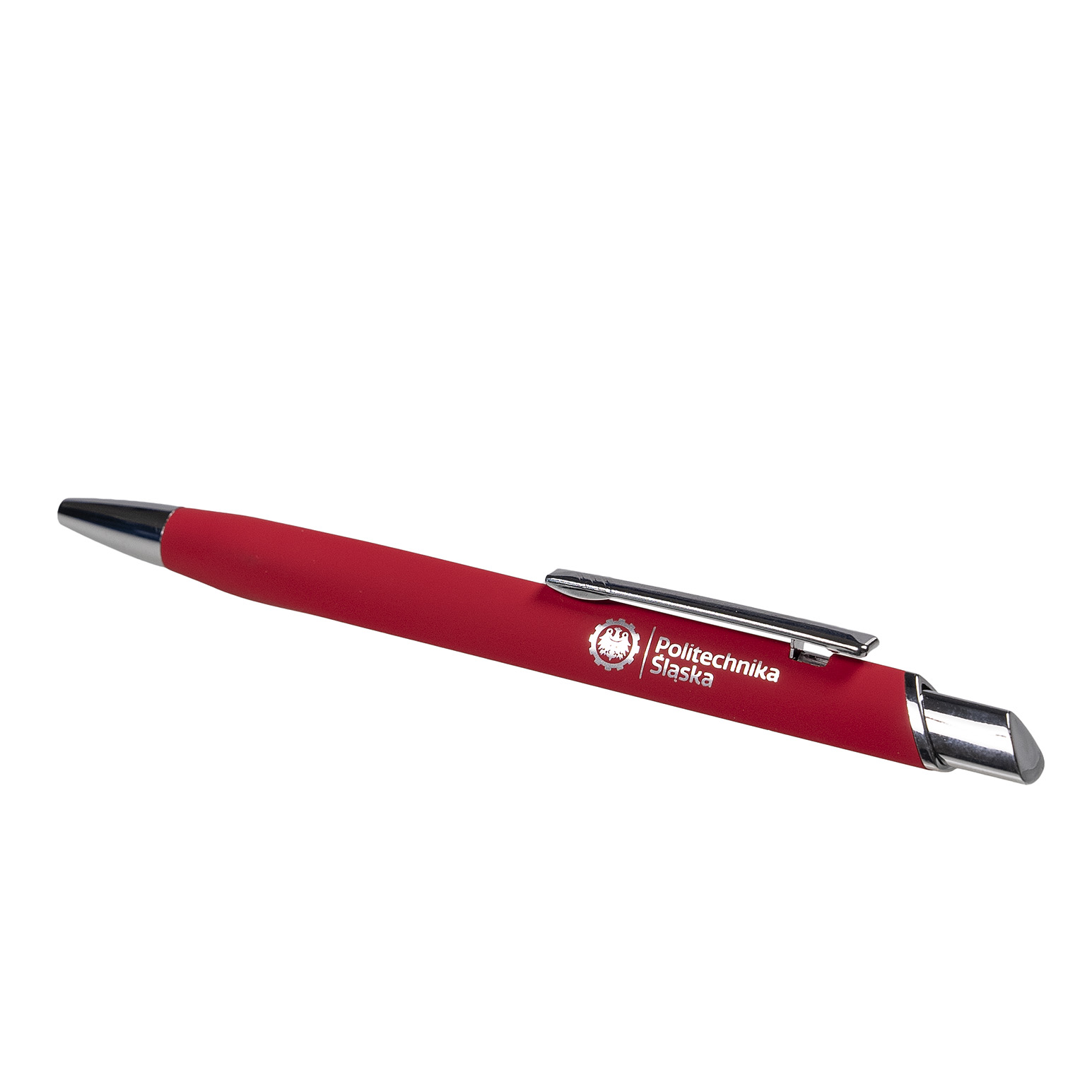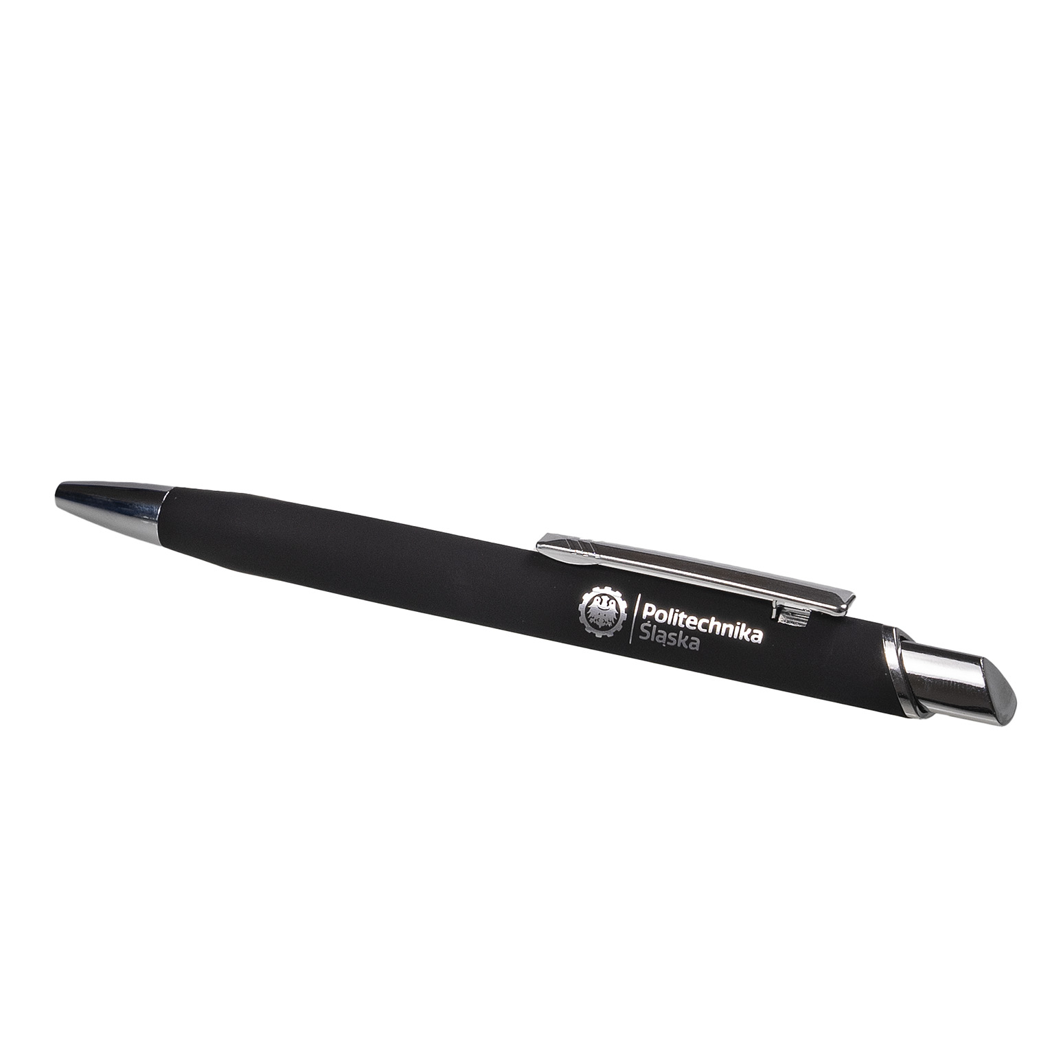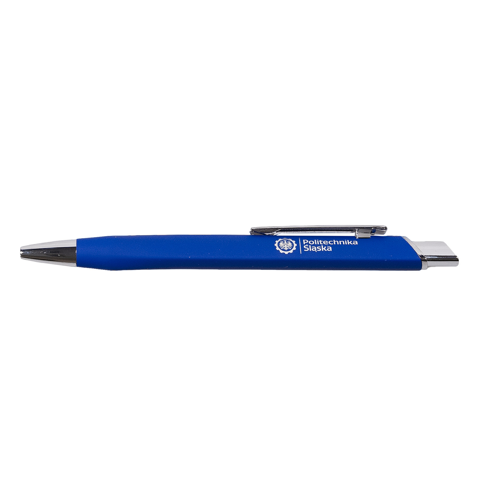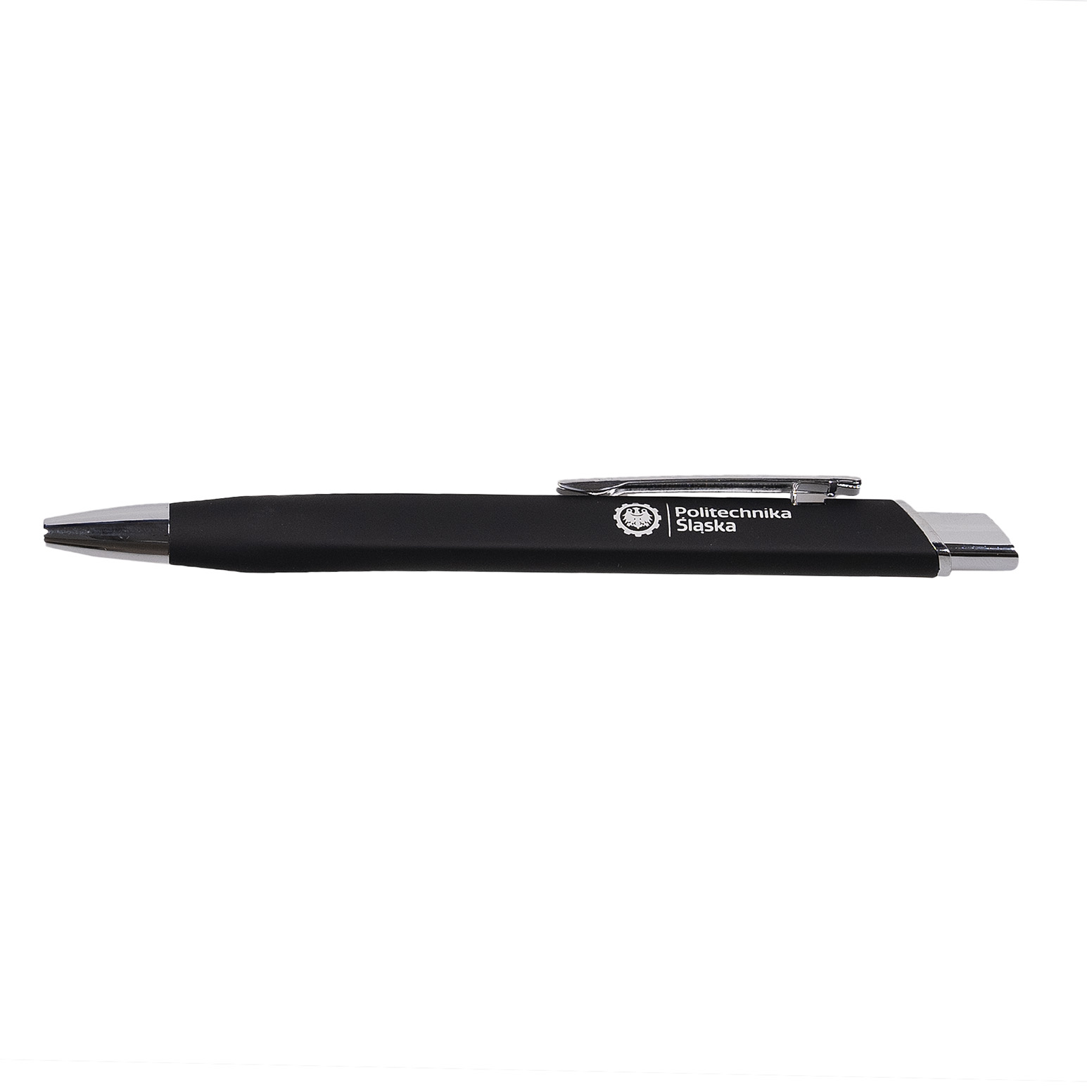 Elegancki i nowoczesny długopis aluminiowy, idealny do codziennego użytku, z grawerowanym logo Politechniki Śląskiej, dostępny zarówno w polskiej, jak i angielskiej wersji językowej.