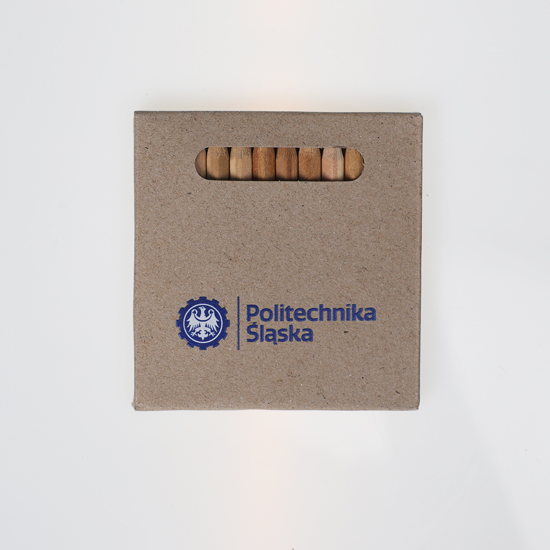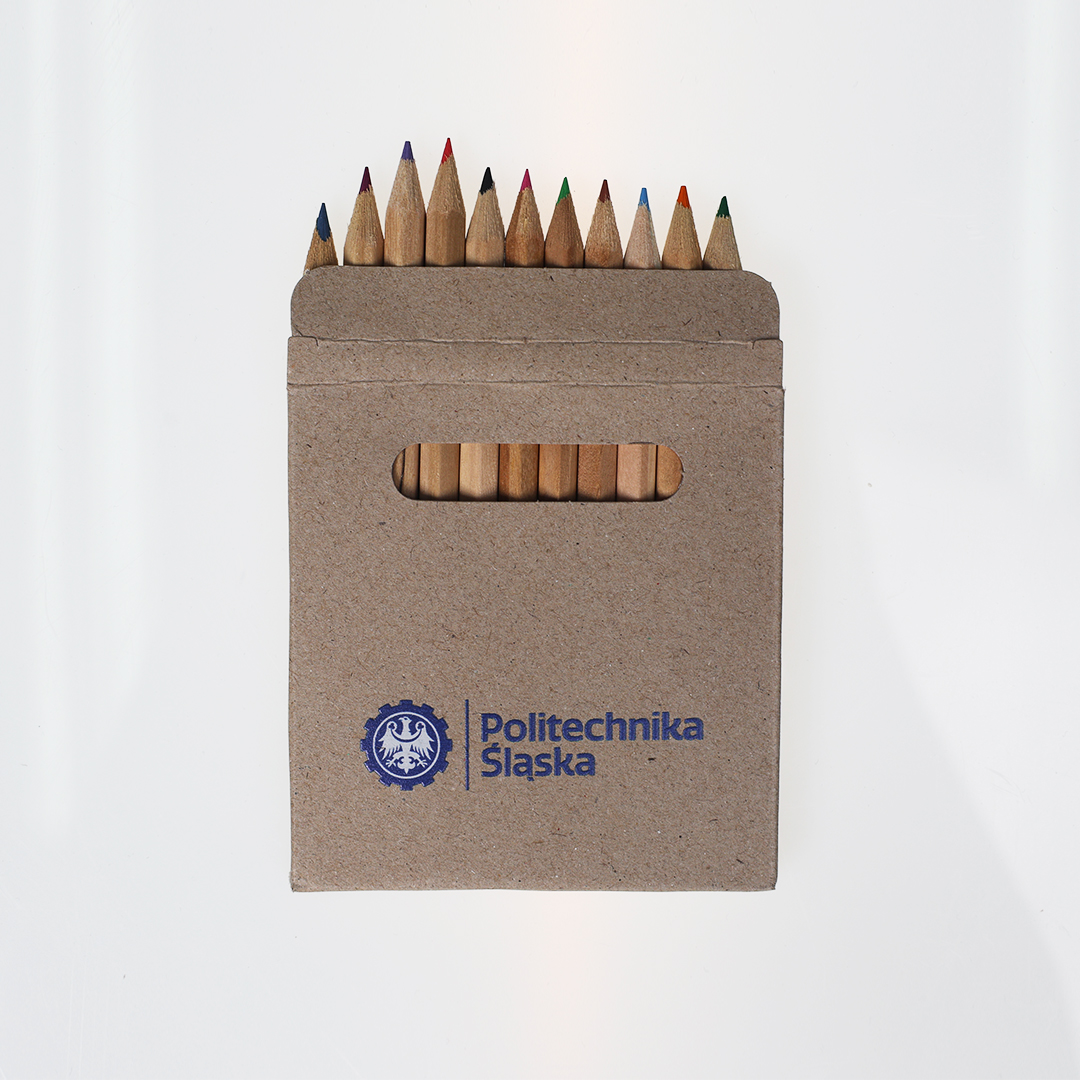 Zestaw kredek w kartonowym pudełku z logo Politechniki Śląskiej.